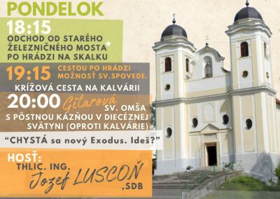 Gitarová mládežka (kaplnka Božieho Milosrdenstva na internáte SOŠ Dopravnej, ul.Školská 66, Trenčín-Zlatovce, 5. posch., A 535). Rôzny program podľa týždňa v mesiaci (adorácia, ruženec, korunka BM, reflexia v skupinkách).