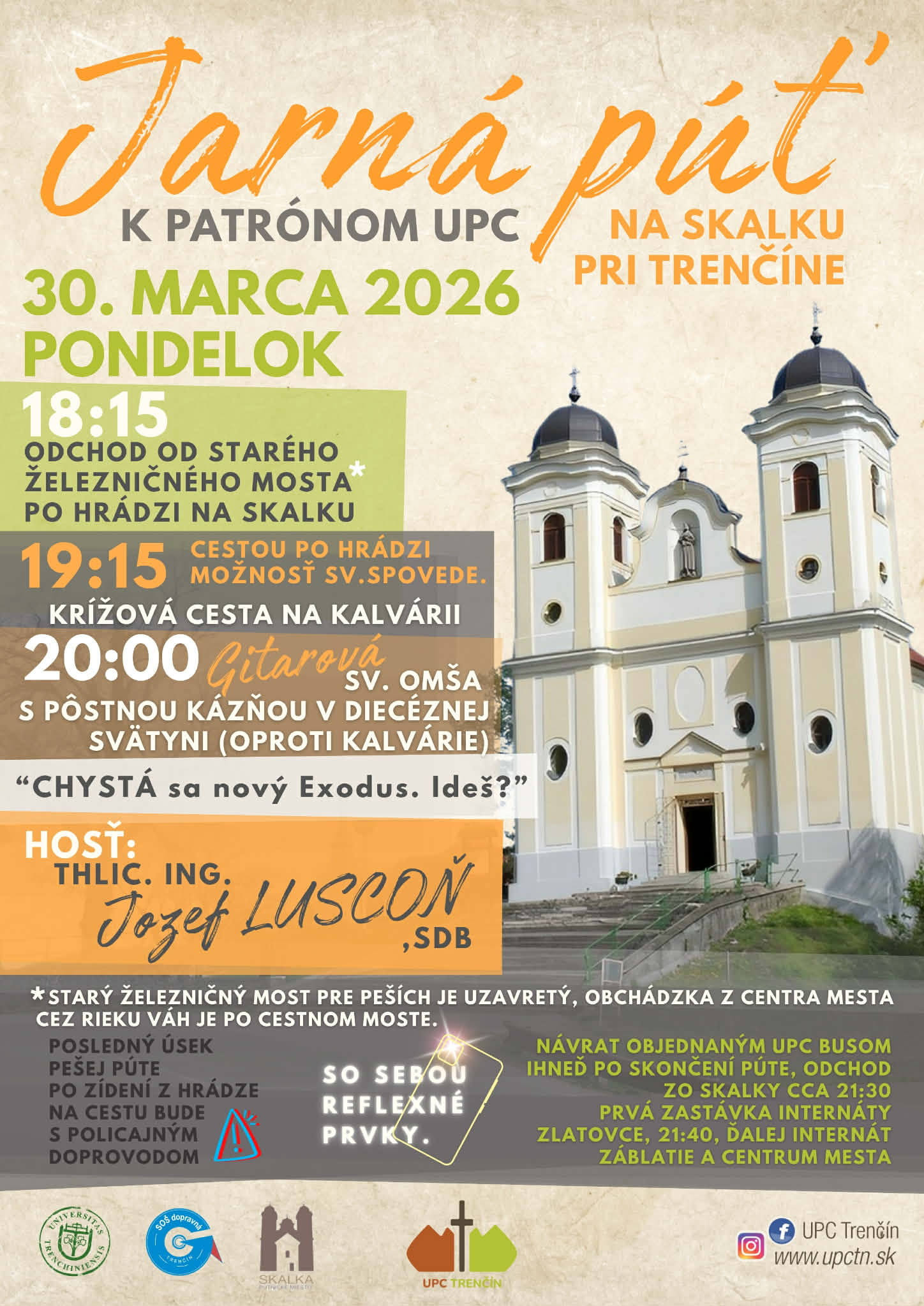Mládežka, vysokoškolské stretko, jedlo, témy, hostia, workshopy (UPC Sihoť, ul.Študentská 1, TnUAD – FZ, B 419). Príprava od 18:30-18:55. Propagácia akcií a výletov prebieha v rámci oznamov na omšiach. Prihlasovanie na obnovy a viacdňové UPC akcie (aj mimo TN) prebieha naživo, po študentských omšiach a na stretkách.